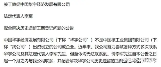其实早在多年前,中国核工业集团就已在《关于中国华宇经济发展有限公司有关事项的声明》中明确指出,华宇公司不是中核集团出资设立的公司或企业。华宇公司设立的各种冠以“中核”字号和号称中核下属公司的企业或机构,均未经过中核集团批准。声明还指出,华宇公司及其子公司各类行为均不能代表中核集团及中核集团所属成员单位,中核集团及所属成员单位不承担华宇公司及其子公司任何行为所造成的一切法律后果。