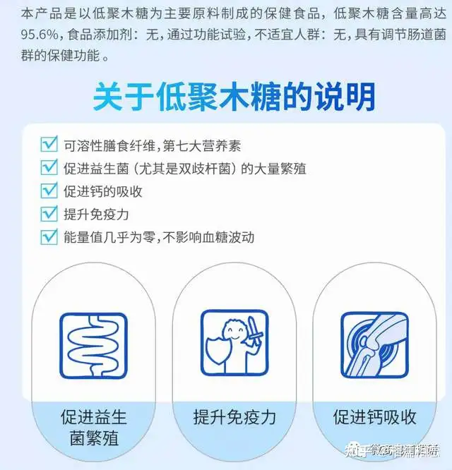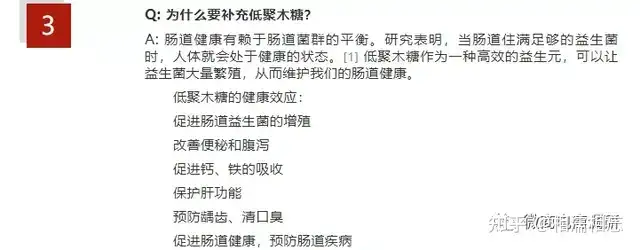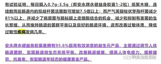 公众号“安永NuLife”在关于该产品的《产品问答》的文章里还提到了“促进肠道益生菌的增殖;改善便秘和腹泻;促进钙、铁的吸收;保护肝功能;预防龋齿、清口臭;促进肠道健康,预防肠道疾病”等功效。