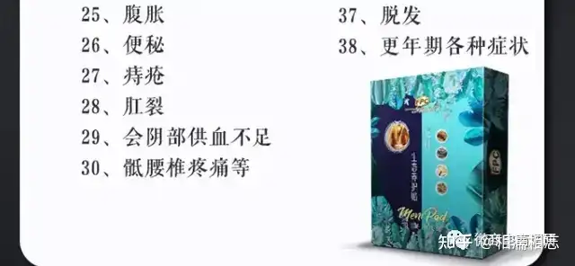 同样,这款产品也免不了被描述为可以调理乃至治疗涉及到包括局部炎症、阴囊潮湿、阳痿、早泄、便秘、肛裂、痔疮、脱发、尿频、尿急等多种病症。