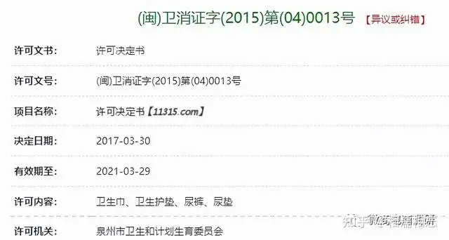 经查绿盾征信网站,我们发现上述许可证号对应的许可内容为卫生巾、卫生护垫、尿裤、尿垫,有效期到2021年3月29日。
