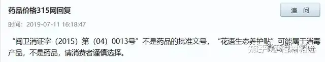 而早在2019年,就曾有网友在药品价格315网上咨询过这款产品的资质,对此,该网回复称:“闽卫消证字(2015)第(04)0013号”不是药品的批准文号,“花语生态养护贴”可能属于消毒产品,不是药品,请消费者谨慎选择。