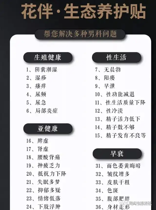 除了针对女性的“花语生态养护贴”,还有针对男性的“花伴生态养护贴”,相关的宣传也是十分夸张。公众号“环保身体”表示该产品可以修复受损的细胞、激活充能,提高雄性激素分泌,使皮肤滋润有光泽、强健体魄,提升性功能、增强自信心。