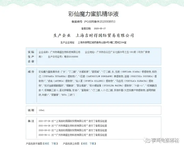 微商电商调研登陆了国家药品监督管理局官网,在国产非特殊用途化妆品备案信息查询发现,彩仙魔力蜜肌精华液的实际生产企业为广州市锦盛生物科技有限公司,该款产品的主要成分为:水、丁二醇、水解胶原、甜菜碱、龙胆根提取物、粉防己提取物、花椒果提取物、连翘提取物、卤虫提取物、仙人掌、提取物、马齿苋提取物、抗坏血酸磷酸酯钠、烟酰胺、聚谷氨酸、极大螺旋藻提取物、六肽-11、棕榈酰四肽-7、棕榈酰三肽-1、氢化卵磷脂、甘油、富勒烯、丁二醇、2-己二醇、芽孢杆菌/大豆发酵产物提取物、透明质酸钠、叶酸、尿囊素、EDTA二钠。
