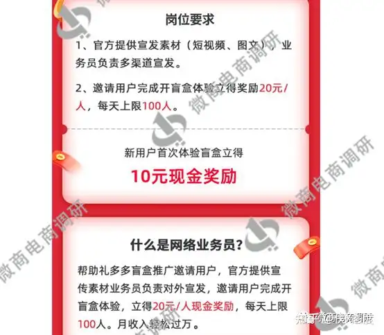 近期,礼多多开始在各大网络平台上发布所谓的“招聘信息”,在全网招聘网络业务员,承诺月薪轻松过万,该职位的要求是帮助礼多多盲盒推广邀请用户,用官方提供的宣传素材对外宣发,邀请用户完成开盲盒体验。可见,这份收益指的其实就是做市场的动态收益。