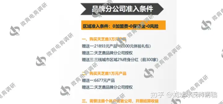 接下来,我们再来关注一下天芝鹿推行的奖金制度该如何解读。据推广人员阿强(化名)提供的资料显示,天芝鹿将参与者分为了两个级别,其一是分公司,其二是运营中心。分公司的门槛有两种,不同门槛对应的权益自然也有所不同,购买3万元产品,可以拿到价值21893元的产品、分公司授权以及三线城市区域2%的分红(前300家);购买1万元产品,可以拿到价值6677元的产品,以及分公司授权。
