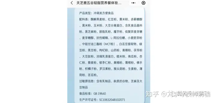 再说回天芝鹿本身,据公开资料显示,天芝鹿品牌是一个集研发、生产、销售于一体的大型健康食品企业,产品线覆盖内服美容品、外用修复品、健康养生品等领域。截至2022年11月,天芝鹿已在微信小程序上推出了多款产品,“天芝鹿五谷轻脂营养餐”便是其中之一。2022年8月,公众号“天芝鹿TianZhiLu”曾在题为《天芝鹿|轻脂营养新「食」尚》的文章中指出“天芝鹿五谷轻脂营养餐”具有提高机体免疫力的功效。