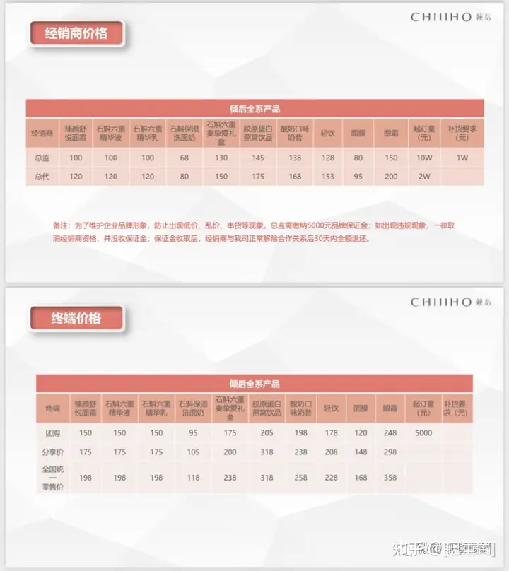 首先是倾后品牌,大致分为分享、团购、总代和总监四层,后三者起订量分别为5000元、2万元和10万元,其中总监需要缴纳5000元品牌保证金,并且有1万元的补货要求,分享级别主要赚取差价,团购和总代级别享有销售利润和推广奖励,总监在此基础上还额外享有销售业绩奖励。具体的产品拿货价如下: