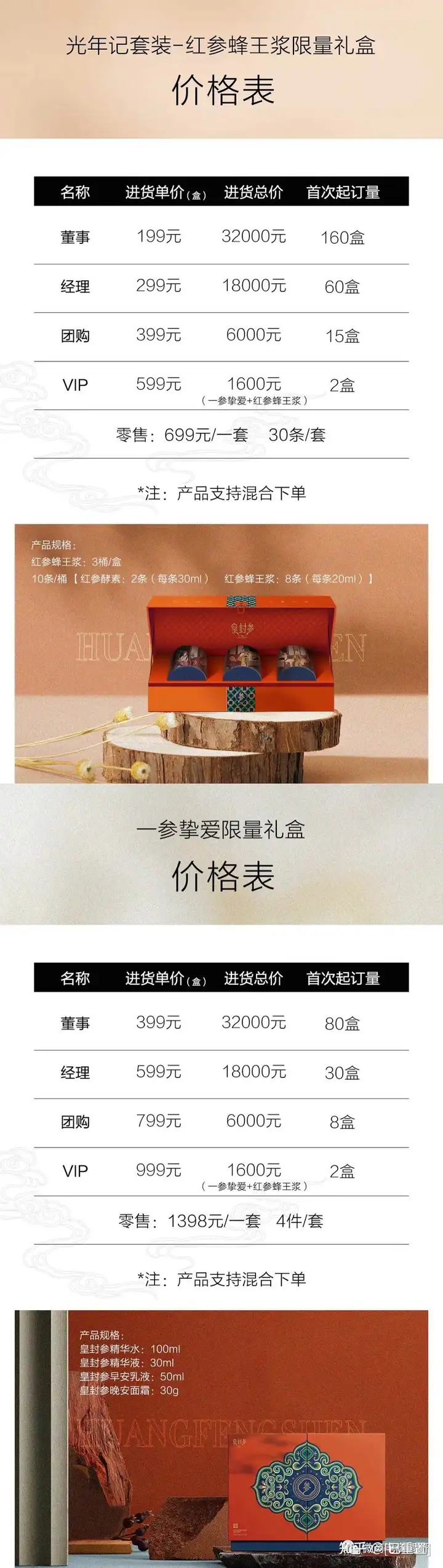 紧接着是皇封参的代理制度,据悉,皇封参的代理一共分为VIP、团购、经理和董事四个级别,其中红参蜂王浆的首次订货量分别为2盒、15盒、60盒和160盒,一参挚爱礼盒的首次订货量分别为2盒、8盒、30盒和80盒,产品支持混合下单,具体价格表如下: