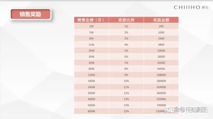 3、季度销售奖金(按照团队结算),首次招商业绩不计入的前提下业绩达到5万元,奖励1%,达到10万元,奖励2%,往后以此类推,最后达到1200万元,奖励最高13%,即156万元。