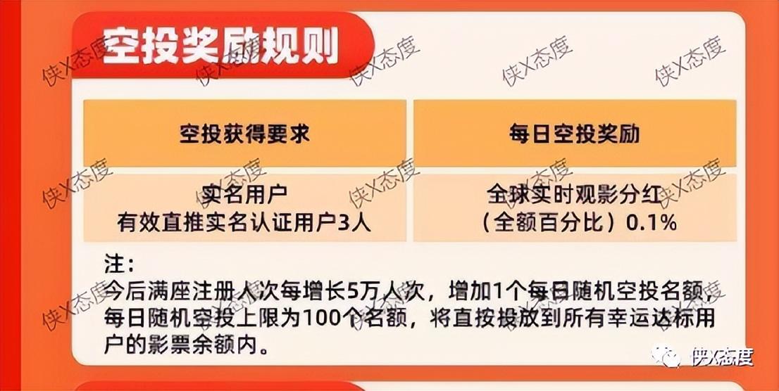 平台为了更好的推广市场,每日随机空投奖励100个用户,如果用户想获取空投奖励需要直推三个实名认证的用户,空投奖励为全球实时观影分红0.1%。