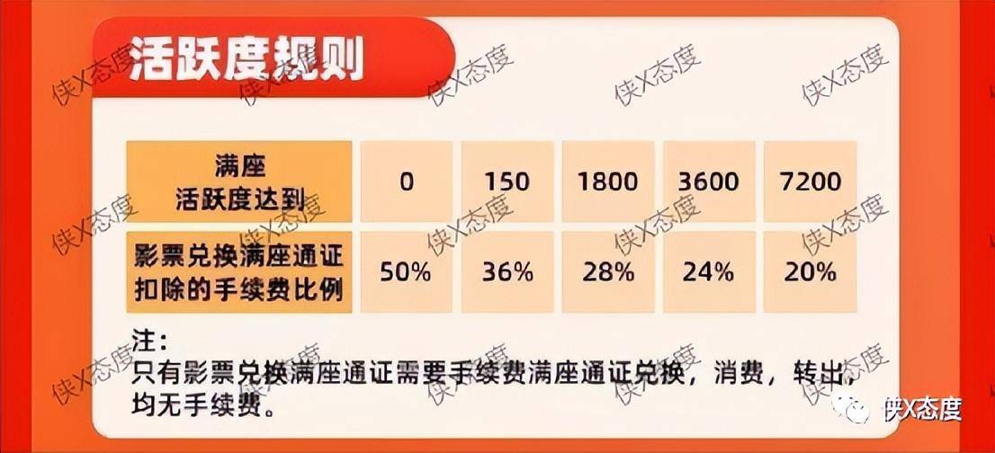 用户获取的活跃度可以用来降低影票兑换通证扣除手续费的比例,活跃度为0的话兑换通证扣除50%的手续费;活跃度达到150,手续费为36%;活跃度达到1800,手续费为28%;活跃度达到3600,手续费为24%;活跃度达到7200,手续费为20%。