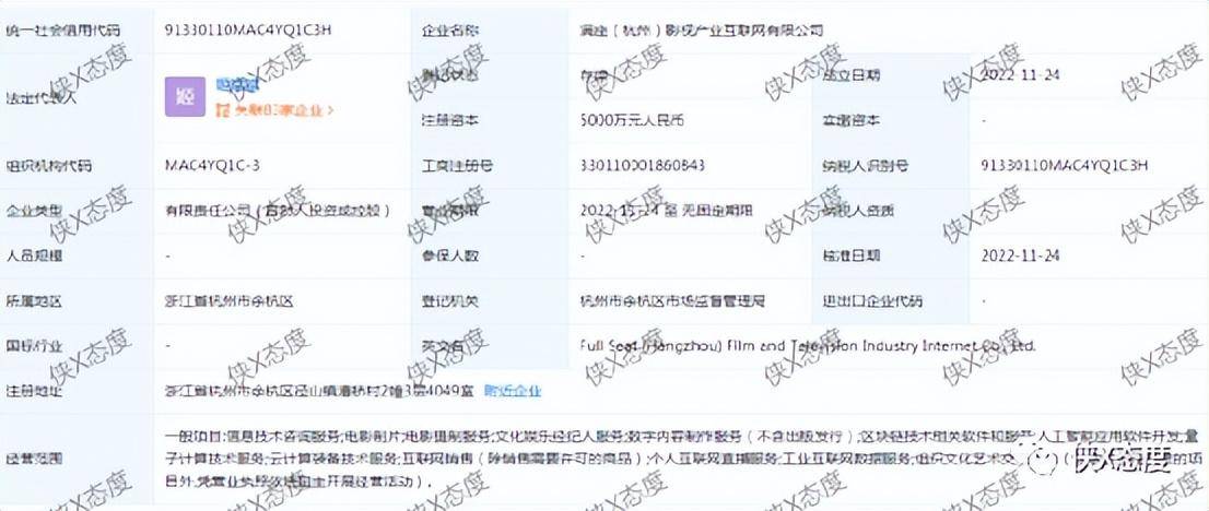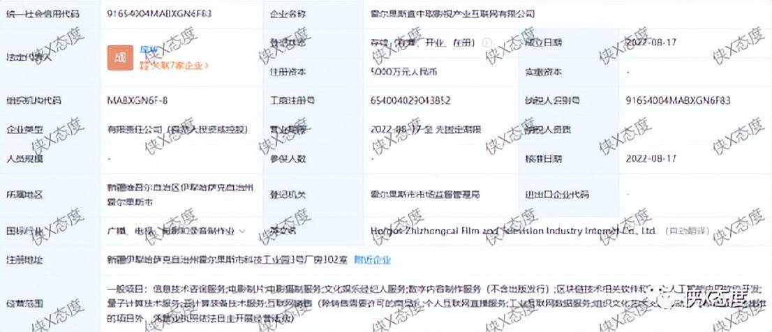 接下来我们来了解一下霍尔果斯直中取影视产业互联网有限公司。经查,该公司成立于2022年8月17日,法定代表人成华,股东为成华(大股东)、祁建强,注册资本5000万元,实缴0元,参保人数0人。