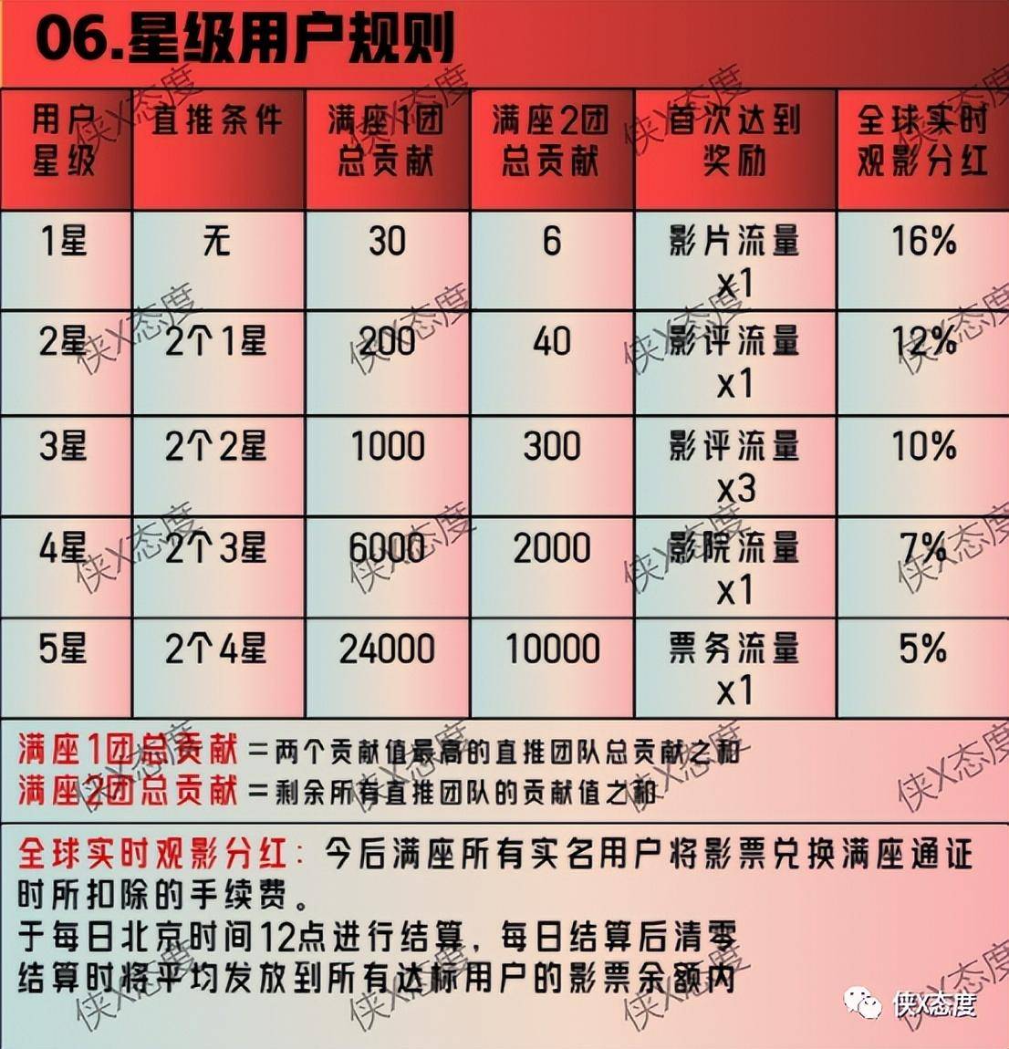 1星:大区贡献值达到30,小区贡献值达到6,即可升级为1星用户,可获得一个影片流量包,以及16%的全球实时观影分红;