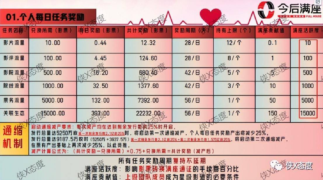接下来为大家介绍下该平台的详细玩法,以及星级制度、奖励制度。据该平台客服提供资料介绍,“今后满座”系统上线之初,为了促进今后满座市场推广发展进程,今后满座将限量发行20万枚满座通证,发行价与回收价均为25元/枚。新用户实名注册平台赠送价值10影票的影片流量包一个,以及0.1的贡献值,用来持续获取影票奖励,周期为28天,通过影票兑换通证来获取收益。