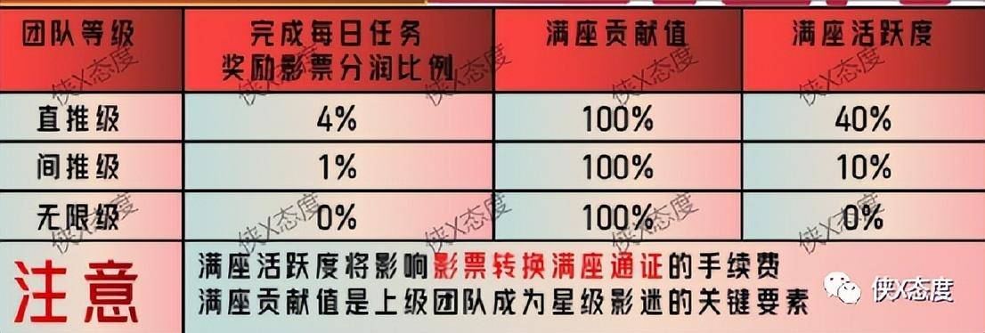 用户直推可获得每日任务奖励影票的4%奖励,以及100%的贡献值,40%的活跃度;间推可获得每日任务奖励影票的1%,以及100%的贡献值,10%的活跃度;无限代只能获得100%的贡献值。