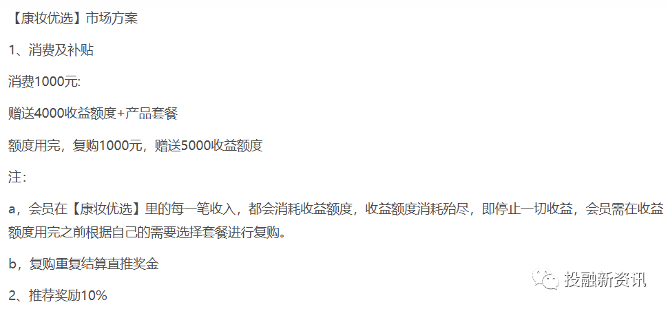 a,会员在【康妆优选】里的每一笔收入,都会消耗收益额度,收益额度消耗殆尽,即停止一切收益,会员需在收益额度用完之前根据自己的需要选择套餐进行复购。