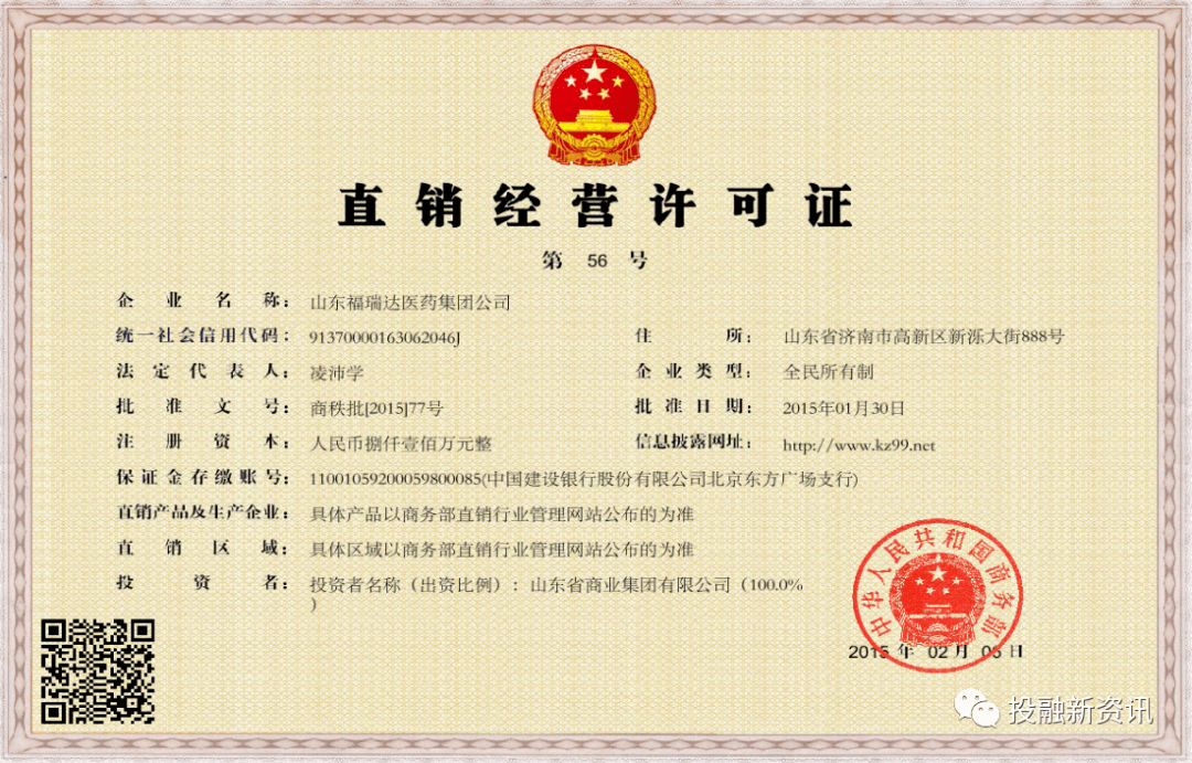 据商务部直销行业管理官网显示,山东福瑞达医药集团有限公于2015年1月30日拿到直销牌照,分支区域一个,位于山东省济南市高新区新泺大街888号,服务网点44个,均位于山东省,直销产品共2类38种,直销培训员共6人。