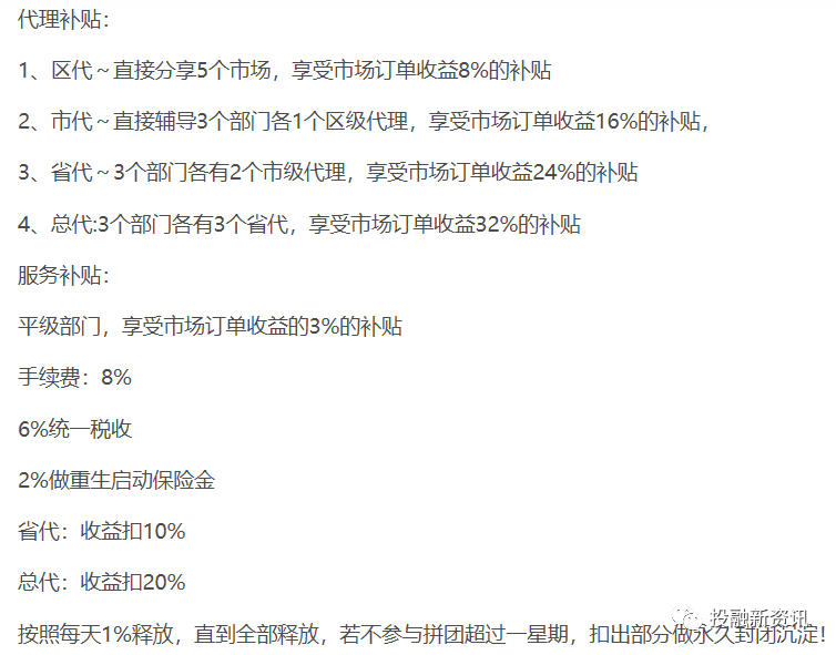 按照每天1%释放,直到全部释放,若不参与拼团超过一星期,扣出部分做永久封闭沉淀!