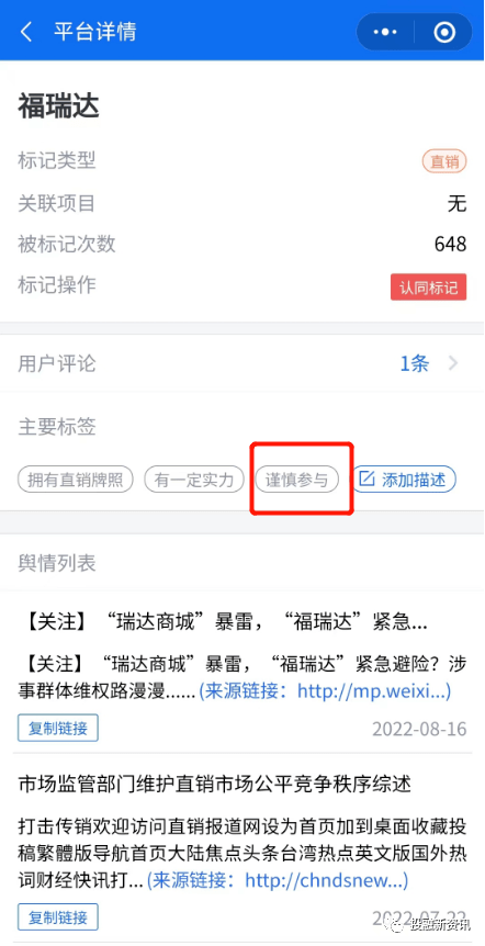 据腾讯平台的灵鲲金融风险查询举报中心显示,福瑞达公司的标记类型虽是“直销”,但其主要标签却有“谨慎参与”的字样。