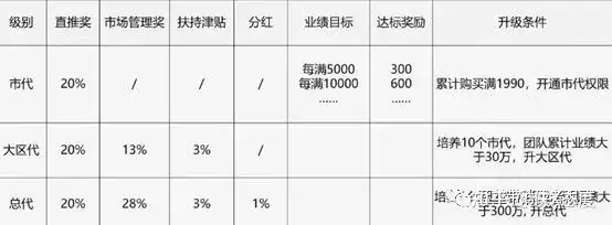 文章的最后,我们再来关注一下科然新零售推行的奖金制度该如何解读。据推广人员阿秀(化名)提供的资料显示,科然新零售的模式属于三级代理模式,有“太阳线”特征,参与者被分为了三个级别,从低到高分别是市代(累计消费金额达到1990元,开通市代权限,获得推广权)、大区代(培养10个市代,团队累计业绩大于30万,升级大区代)和总代(培养5个大区代,团队累计业绩大于300万,升级总代),具体奖励如下: