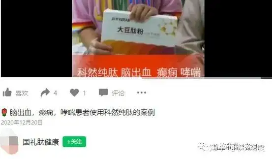 另外值得一提的是,2022年7月,官方公众号“科然新零售”还发布了题为《还以为肽是保健品吗?你错了!肽更全面!》的文章,文章在“科然大豆小分子纯肽”的下方,指出“肽”具有抗肿瘤等医疗作用,同时,在这些所谓的“科普信息”下方,也出现了包括科然大豆肽粉小分子纯肽在内的多款普通食品的外包装,因而,上述文字信息可能会误导消费者,令其误以为该产品具有抗肿瘤等作用。