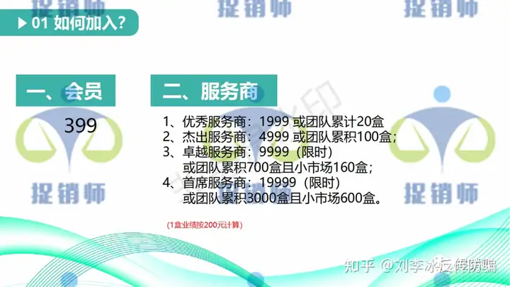 加入级别及投入金额:会员:399元;优秀服务商:1999或团队累计20盒;杰出服务商:4999或团队累计100盒;卓越服务商:9999(限时)或团队累计700盒且小市场160盒;首席服务商:19999(限时)或团队累计3000盒且小市场600盒。一盒业绩按200元计算。