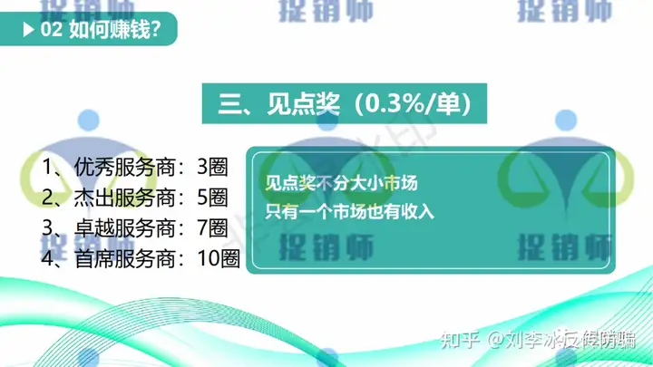 3、见点奖:0.3%/单,优秀服务商3圈~首席服务商10圈。见点奖不分市场大小,只有一个市场也有收入。