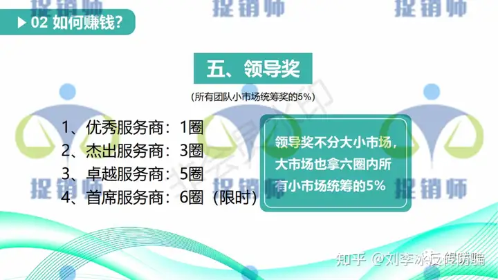 5、领导奖:所有团队小市场统筹奖的5%,领导奖不分大小市场,大市场也拿6圈内所有小市场统筹的5%。