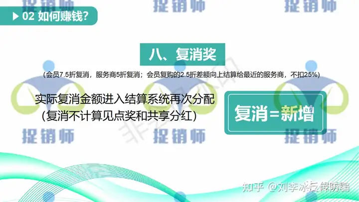 8、复消奖:复消=新增;会员7.5折复消,服务商5折复消;会员复购的2.5折差额向上结算给最近的服务商,不扣25%。实际复消金额进入结算系统再次分配(复消不计算见点奖和共享分红)
