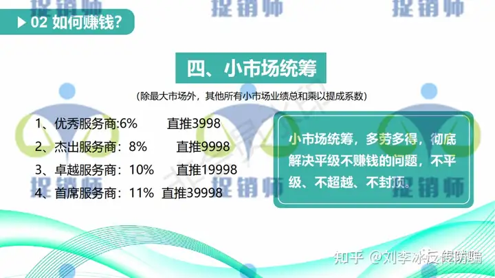4、市场统筹:除最大市场外,其他所有小市场业绩总和乘以提成系数。优秀服务商6%,直推3998;杰出服务商8%,直推9998;卓越服务商10%,直推19998;首席服务商11%,直推39998。