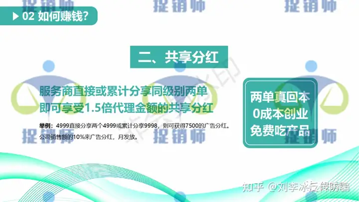 2、共享分红:服务商直接或累计分享同级别两单即可享受1.5倍代理金额的共享分红,举例:4999直接分享2个4999或累计分享9998,即可获得7500的广告分红。公司销售额的10%来广告分红,月发放。
