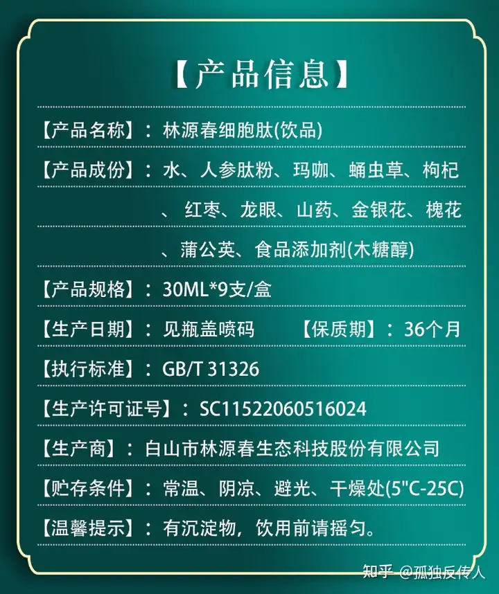 但发现,“林源春细胞肽”的食品类别仅是一款食品饮料,执行标准业为gbt31326,即植物饮料食品标准。换句话说就是一款普通食品,不应具有任何保健功效。同时,详细查看其产品成分表可以发现,其中并无所谓的“太岁”成分,也无“肉灵芝”成分。