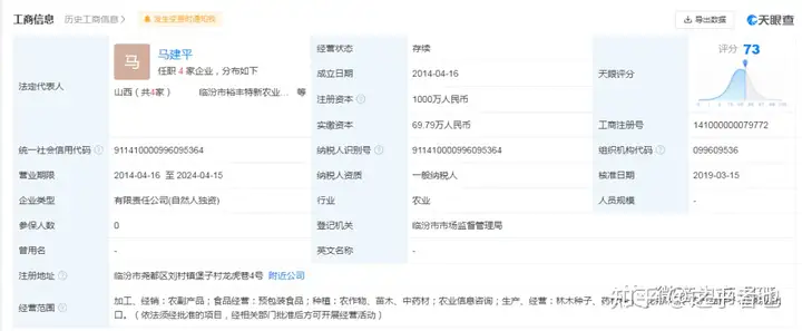 临汾市裕丰特新农业开发有限公司(简称裕丰特农业公司)成立于2014年4月16日,注册资本1000万元,实缴资本69.79万元,法定代表人马建平,但是该公司的实际控制是裕丰特农业公司董事长贺秀云,通过股权链分析,在裕丰特农业公司投资的山西裕丰特连翘产业发展有限公司,以及山西农谷神农道饮药茶有限公司中,贺秀云原本持股山西裕丰特连翘产业发展有限公司的66%股权,但在2020年12月9日退出持股,新增为裕丰特农业公司独资,而在另一家山西农谷神农道饮药茶有限公司中,贺秀云担任监事。