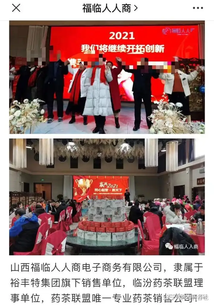 通过我们调查,裕丰特新农业公司的创始人名叫贺秀云,多年来,贺秀云一直在为连翘茶的推广而做努力。而在裕丰特公司的背后,山西福临人人商电子商务有限公司浮出水面,据其官方微信公众平台发布的文章介绍,福临人人商隶属于裕丰特公司,是裕丰特公司的销售单位,主要负责人为赵天佑、庞董荣。