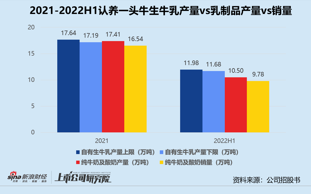 这一点在招股书中并没有详细说明,但按照自有牧场采购金额以及成本均价计算,2021和2022年1-6月的采购生牛乳分别约为14.85万吨、10.62万吨。
