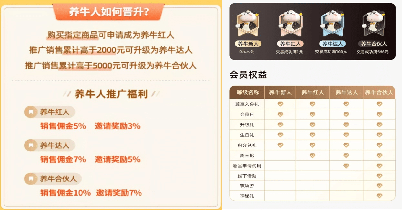 据彼时官方公众号信息显示,消费者购买2000元以下的产品,可以申请成为初级分销员,获得“养牛红人”称号。推广销售累计超2000元,可升级为“养牛达人”称号。超5000元成为“养牛合伙人”。根据推广效果,养牛合伙人可以从中获得5%至10%的佣金。如果朋友接受邀请加入“养牛团队”,消费者还能获得3%至7%的拉新奖励。