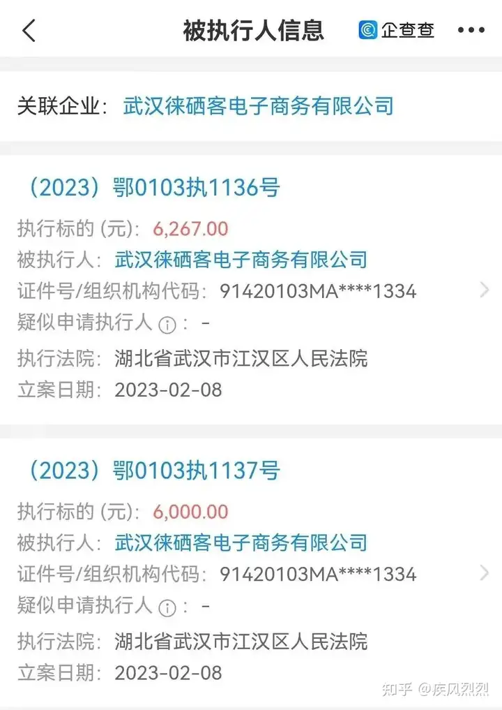 2、案号(2023)鄂0103执1137号,立案日期2023年2月8日,执行标的6000元,执行法院湖北省武汉市江汉区人民法院,被执行人武汉徕硒客电子商务有限公司;