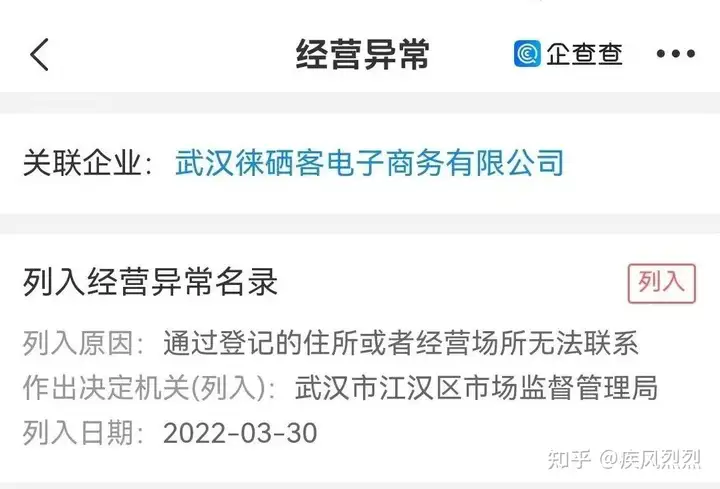 另外2022年3月30日,武汉徕硒客电子商务有限公司殷“通过登记的住所或者经营场所无法联系”被武汉市江汉区市场监督管理局列入异常。