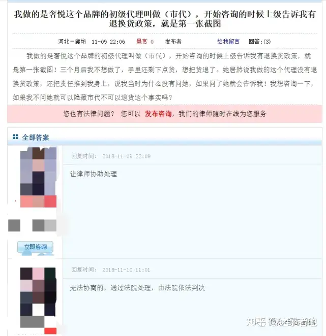 另外,我们发现还有消费者曾在法律110平台求助相关律师:我做的是奢悦品牌的市代代理,最开始咨询时对方说有退换货政策,三个月之后我不想做了,手里还剩下一些货,想把货退了,对方却说这个代理没有退换货政策,还说我为什么最开始不问,把过错推到我身上。