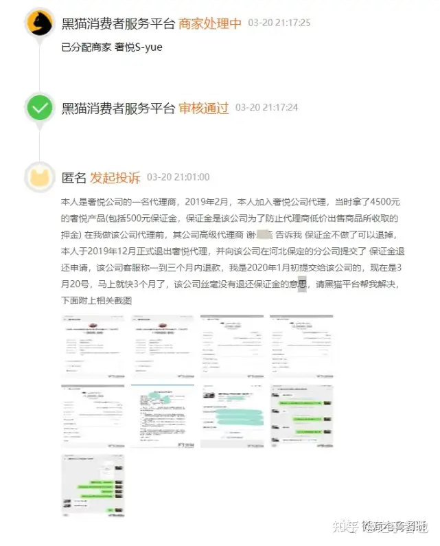 除此之外,奢悦还因退还保证金问题遭到不少投诉。在黑猫投诉平台上,有消费者表示,自己是奢悦的一名代理商,2019年2月拿了4500元的奢悦产品成为了代理,其中包括500元的保证金,保证金是公司为了防止代理商低价出售商品所收取的押金,而当时公司的上级经销商说如果不做了保证金可以退掉,自己在2019年12月正式退出奢悦的代理,并向公司提交了保证金退还申请,当时公司的客服说一到三个月内退款,现在就快三个月了,公司丝毫没有要退还保证金的意思。