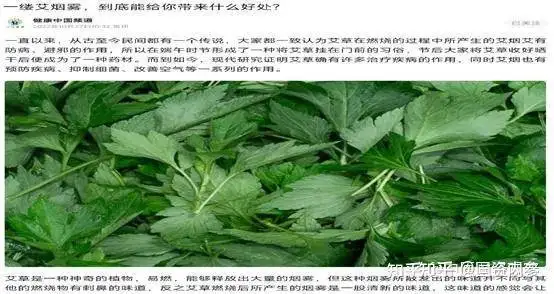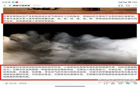 10月27日,“健康中国频道”发表“一缕艾烟雾,到底能给你带来什么好处”文章。称艾烟能够对交感神经起到较强的调节作用,人体吸收后能够有效的起到镇静作用,同时还能缓解压力;艾烟中所含的硒是一种能够有效抗癌的成份,可增加人体的免疫力、平喘止咳;艾烟同时还有抗菌、抗真菌、抗病毒、净化空气的作用可预防传染病;艾烟中的甲醇提取物还有抗氧化和清除自由基的作用,可防癌抗衰老;艾烟具有抗真菌作用,艾烟熏对各种致病性皮肤真菌均有不同程度的抑菌作用。