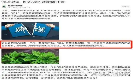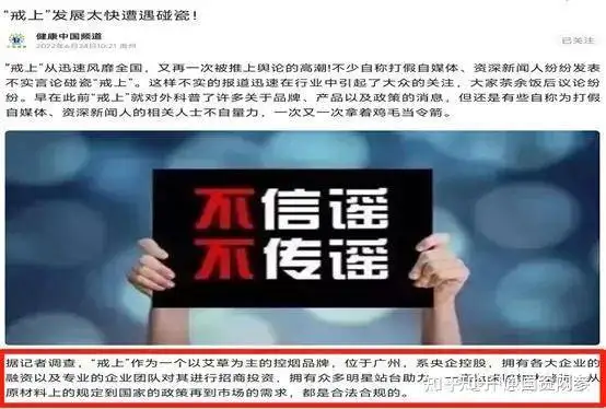 6月22日、23日、24日,7月6日、12日,“健康中国频道”连续发表“戒上艾烟遭遇碰瓷,投资人站台艾草功效引争议”、“戒上辟谣,但没人信?这锅我们不背!”、“戒上发展太快遭遇碰瓷”、“戒上碰瓷黑媒体,监管部门怎么看”及 “从培训师变投资人,他做了什么?”等文章, 在文章中,该账号称:“据记者调查,戒上作为以艾草为主的控烟品牌,位于广州,系央企控股……从原材料上的规定到国家的政策再到市场的需求,都是合法合规的”。