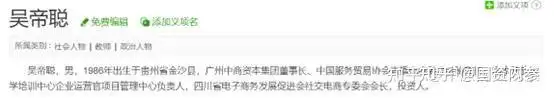 公开资料显示:吴帝聪,男,1986年出生于贵州省金沙县,广州中商资本集团董事长、中国服务贸易协会直播电商委员会秘书长、国家开放大学培训中心企业运营官项目管理中心负责人,四川省电子商务发展促进会社交电商专委会会长,投资人。