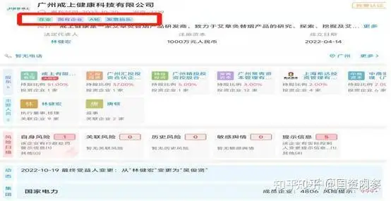 广州戒上健康科技有限公司(以下简称戒上健康)成立于2022年4月14日,其大股东戒上有限公司成立于2022年7月25日,注册地址位于河南省开封市祥符区陈留镇乡贤大道66号。由于戒上有限公司由中为盛世科技(北京)有限公司100%控股,中为盛世科技又被中巨电投(浙江)实业有限公司100%控股,后者是国家电力公司100%控股股东,所以尽管戒上健康成立不足半年,而戒上有限公司“出生”仅四个月,怎奈“玉叶金柯”、“佩金带紫”,二者以“国企”自居。
