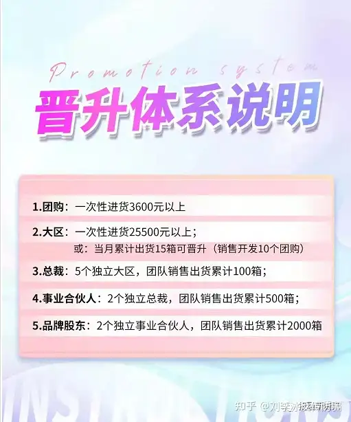 当然足够优秀的话,公司还有更为完善的晋升体系,具体有团购、大区、总裁、事业合伙人以及品牌股东5个层次,具体晋升机制如下: