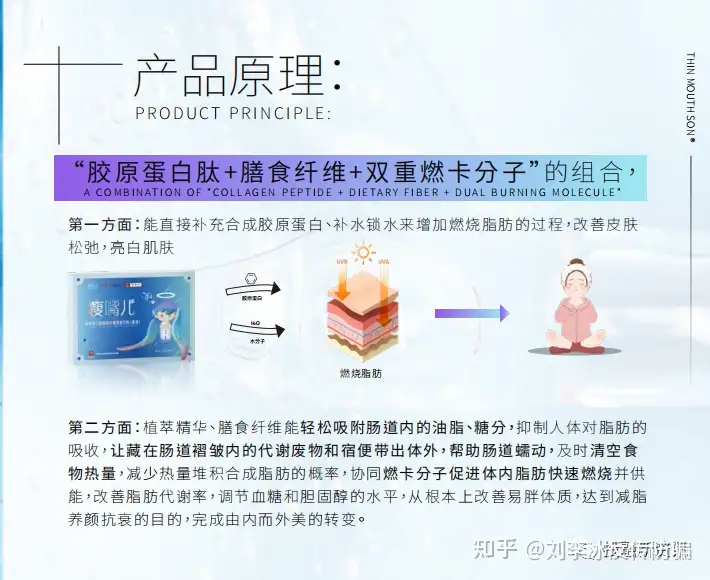 据推广者介绍,其产品原理有二:1.能直接补充合成胶原蛋白、锁水补水增加燃烧脂肪的过程,改善皮肤,两百肌肤;2.让脂肪快速活跃起来,加速脂肪细胞的更替。平衡食物营养摄入,抑制粮糖份吸收,均衡补充必需能量,减少饥饿感,促进脂肪燃烧,加速机能代谢之功效,达到绿色瘦身,健康减,病杜绝反弹打造易瘦体质的瘦身效果。