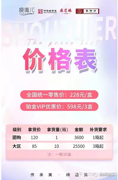 从代理提供的价格表上可以看出,全国统一零售价是228元/盒,598元/3盒就能成为铂金VIP;团购的拿货价是120元,补货要求1箱起(一箱=30盒);大区的拿货价是85元,补货要求是3箱起。