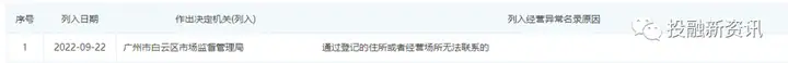 于今年的9月22日,因通过登记的住所或者经营场所无法联系到,被列为经营异常。