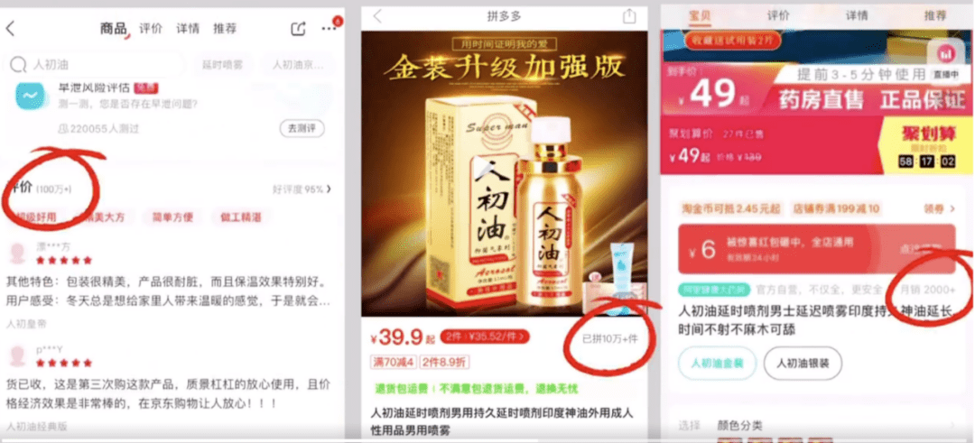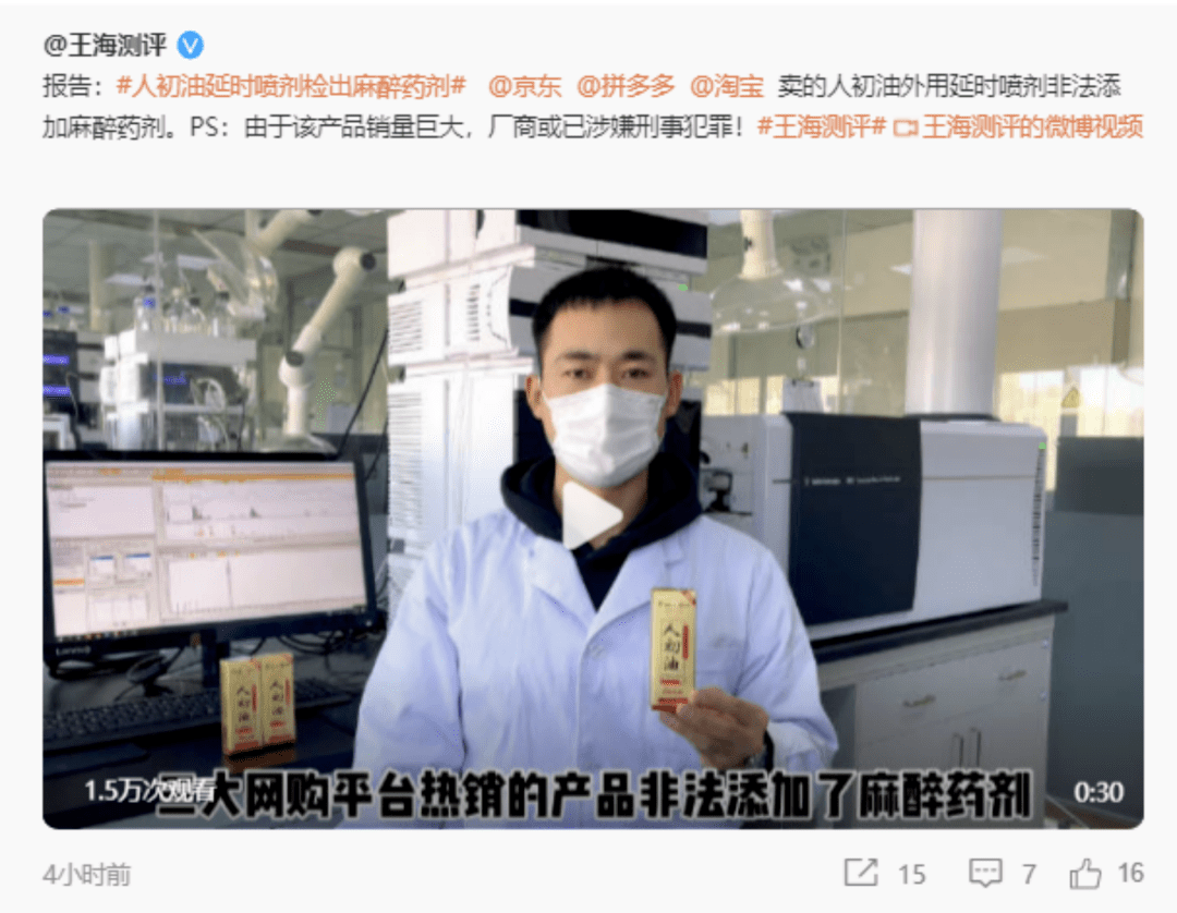微博称,王海检测在拼多多、京东和淘宝都购买了人初油外用延时剂,经检测确认该产品检出了笨佐卡因、丁卡因两种麻醉药剂,属于非法添加。由于三大网购平台的销量巨大,望该产品的出品方深圳市人初集团、深圳市人初医疗用品有限公司尽快主动赔偿消费者并向公安机关投案自首。同时,建议买到该产品的消费者尽快停止使用,并向厂家要求退赔。