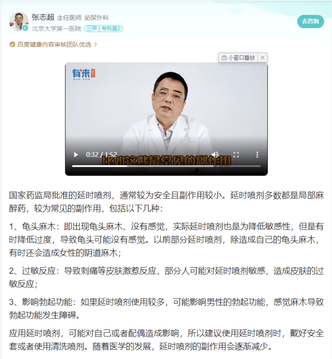 据北京大学第一医院泌尿外科主任医师张志超介绍,国家药监局批准的延时喷剂,通常较为安全且副作用较小。延时喷剂多数都是局部麻醉药,较为常见的副作用,包括以下几种:
